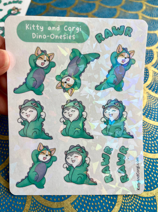 Kitty and Corgi Dino Onesies Sticker Sheet