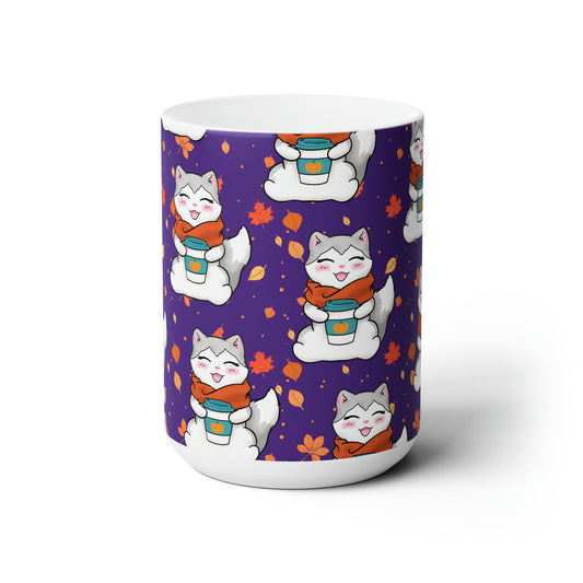 Kitty loves her seasonal Fall drinks! - Purple patterned mug - 15oz