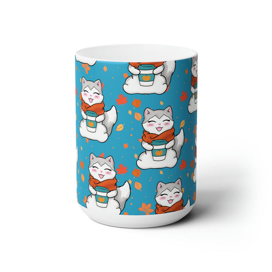 Kitty loves her seasonal Fall drinks! - Turquoise patterned mug - 15oz