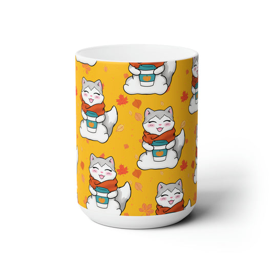 Kitty loves her seasonal Fall drinks! - Autumn Yellow patterned mug - 15oz