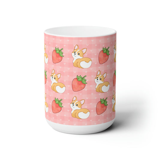 Corgi Butt and Strawberries Pink Heart Gingham 15 oz Mug