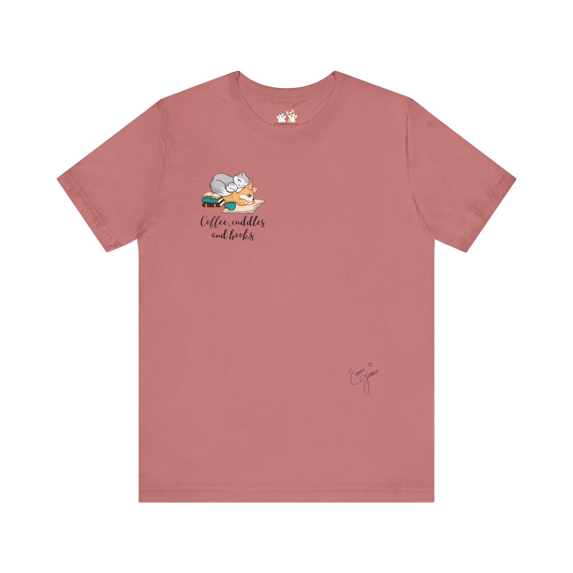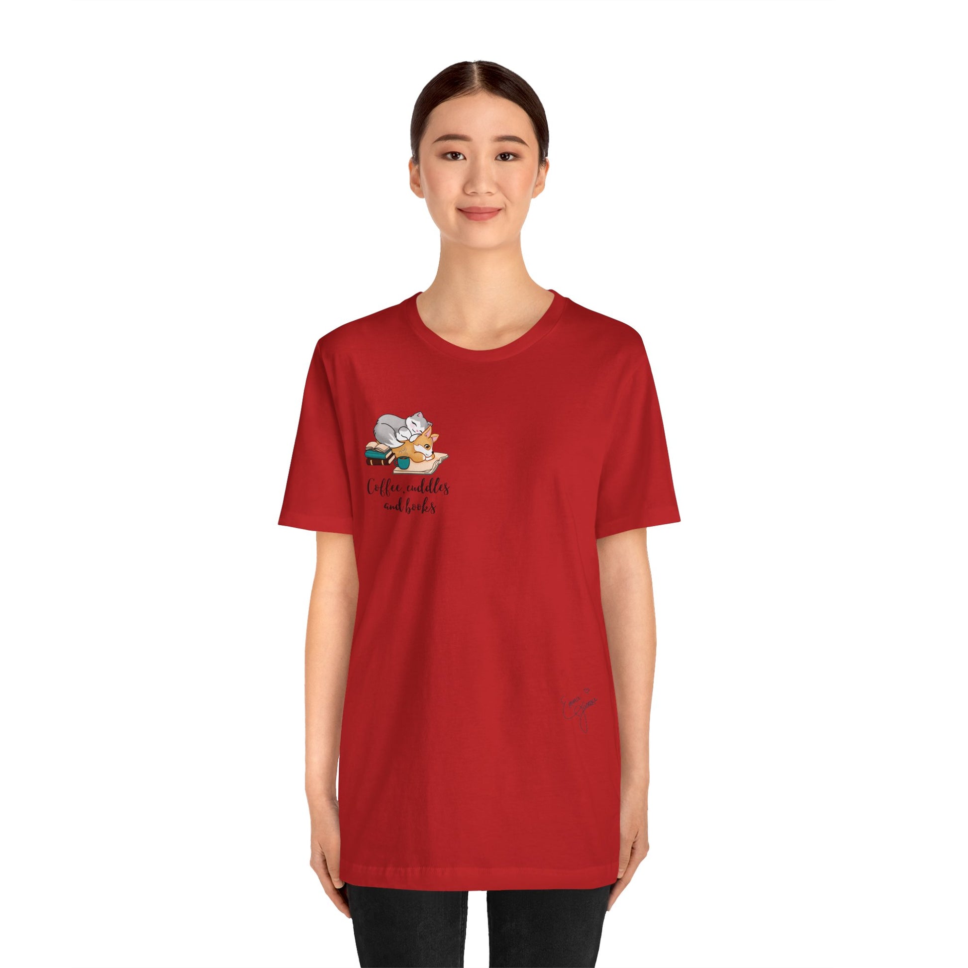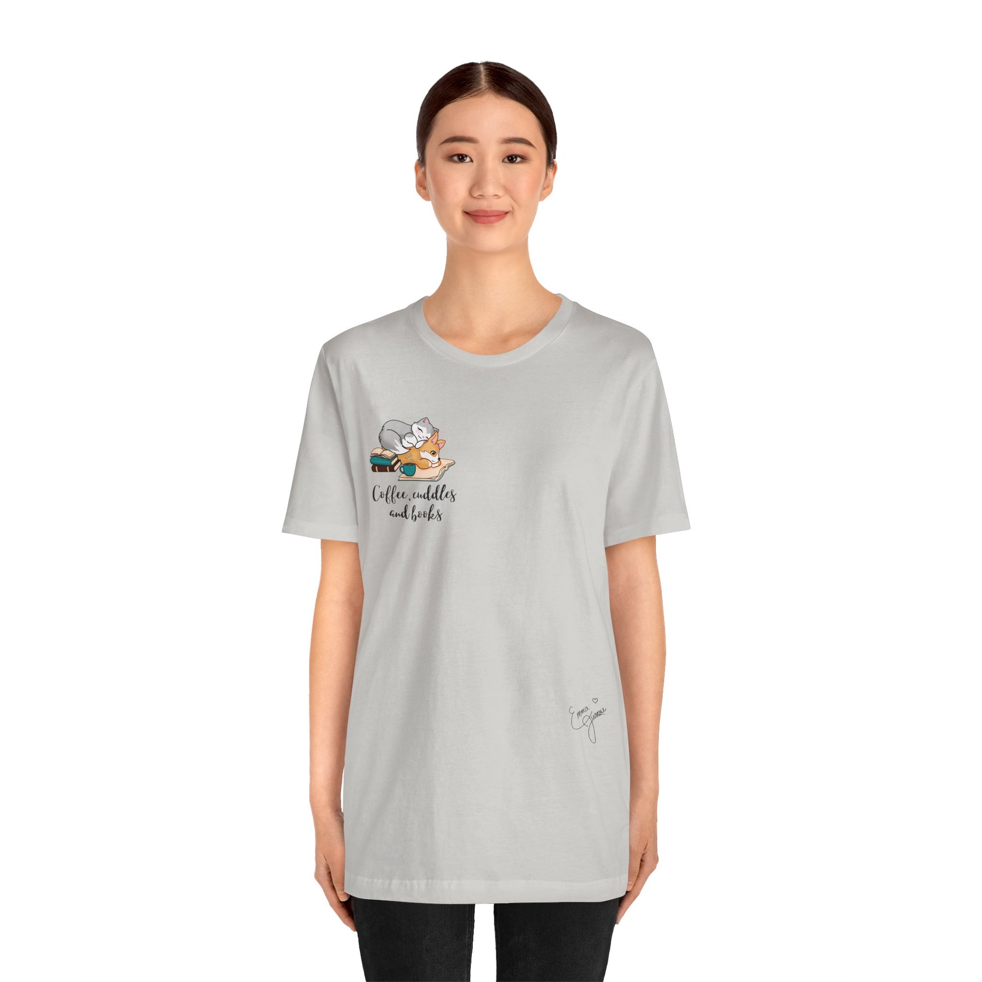 Kitty and Corgi — Coffee, Cuddles, and Books — Super Soft Cotton Airlume Unisex T-Shirt