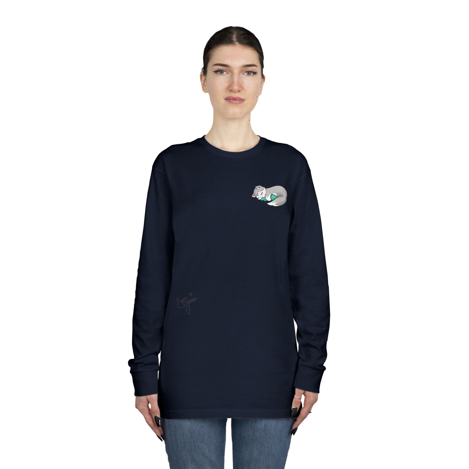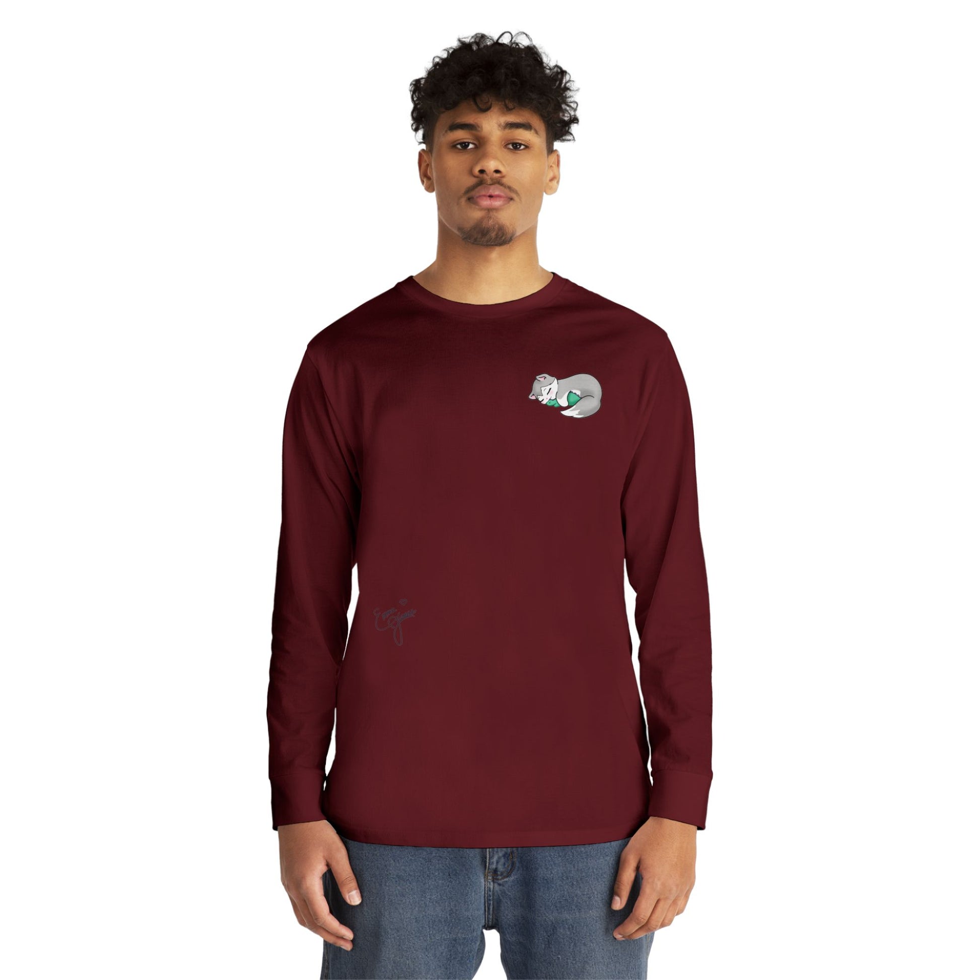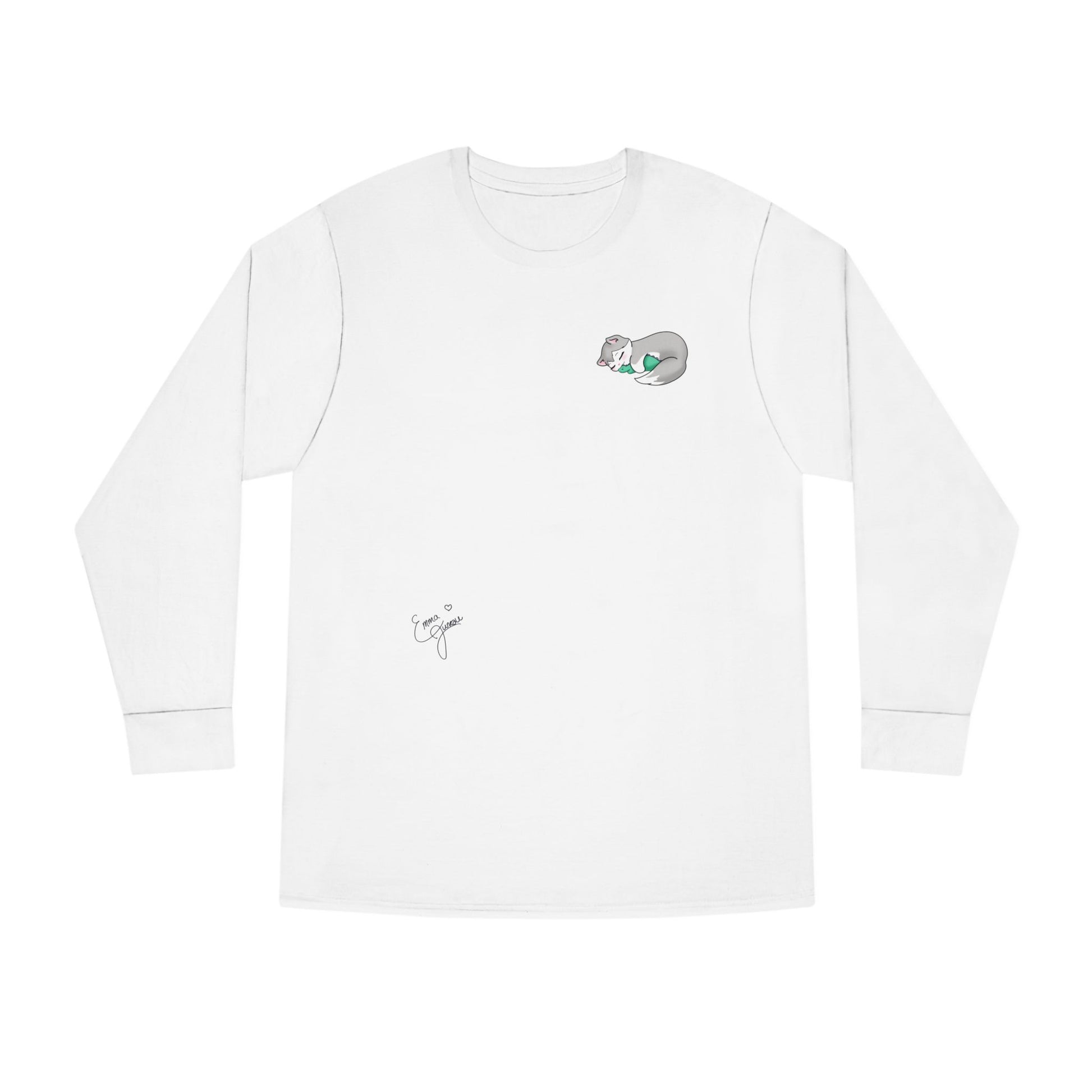 Soft and simple — this long sleeve crewneck tee features Sleepy Kitty snuggled up with her favorite Dino Plushie on the chest. The lightweight cotton drapes easily for layering and moves with you during slow mornings, study sessions, or neighborhood strolls. Seams and shoulder tape keep the shape neat after many washes. Wear it when you want something understated that still signals a gentle sense of home and calm.